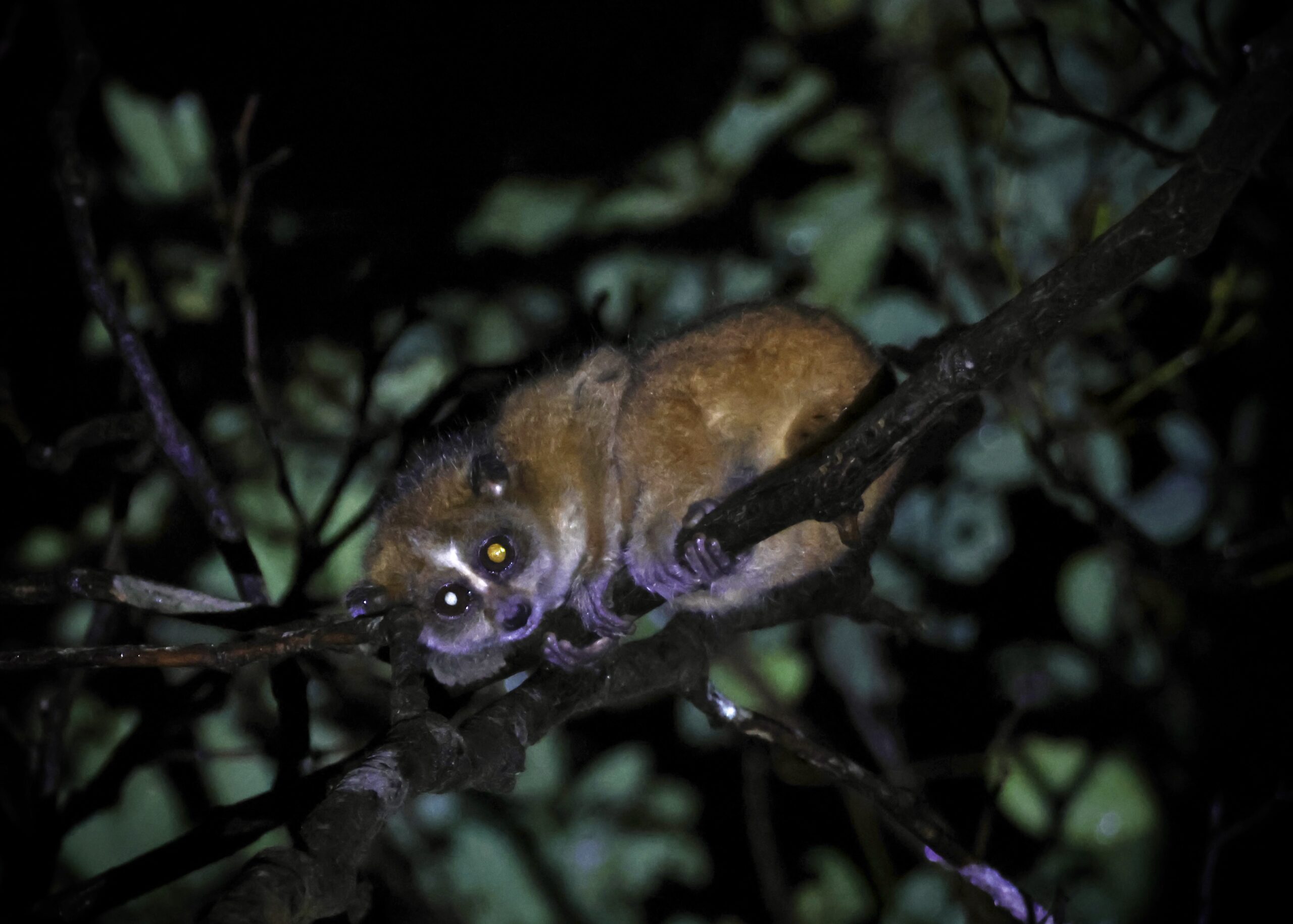As always on our mammal tours, we were planning to have a long night. Unfortunately, it was raining very heavily, so we had to start later than expected. Before going to the summit, we tried to again along the trail that we did the night before and it was absolutely worth it! We found a Pygmy Slow Loris right in the middle of the trail on a dead tree! It was seemed to have been crossing the path and then froze in our torch light. What a view, so close that we could see its fur, finger, bright eyeshine and face, all without binoculards. A cute almost alien species, is how we describe it sometimes! A Loris species is always a big highlight for any mammal trip.